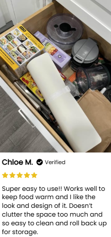 Crafted from premium, nano coated silicone, it’s durable, splash proof, and incredibly easy to clean, just wipe and go. The flexible, roll up design makes it a breeze to store, and its energy efficient performance keeps your meals warm using minimal power.
